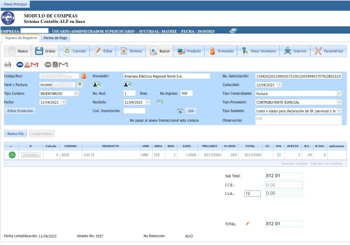 • Ingreso de compras de inventarios, servicios (luz, agua, teléfono, honorarios, etc.), proveedurías (suministros de oficina), activos.
