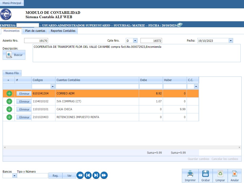 • Impresión de comprobantes contables (retenciones, diario, egreso, ingreso a bodega).
