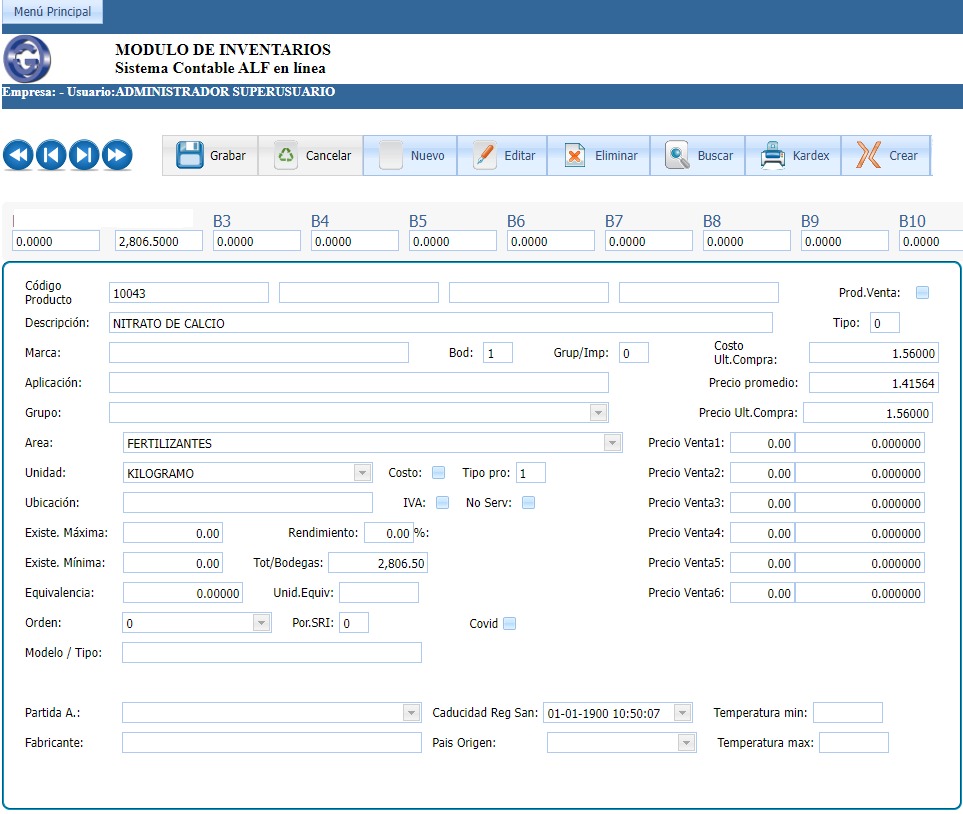 • Ficha del producto, listado de productos, control de existencias mínimas y máximas, código de barras.